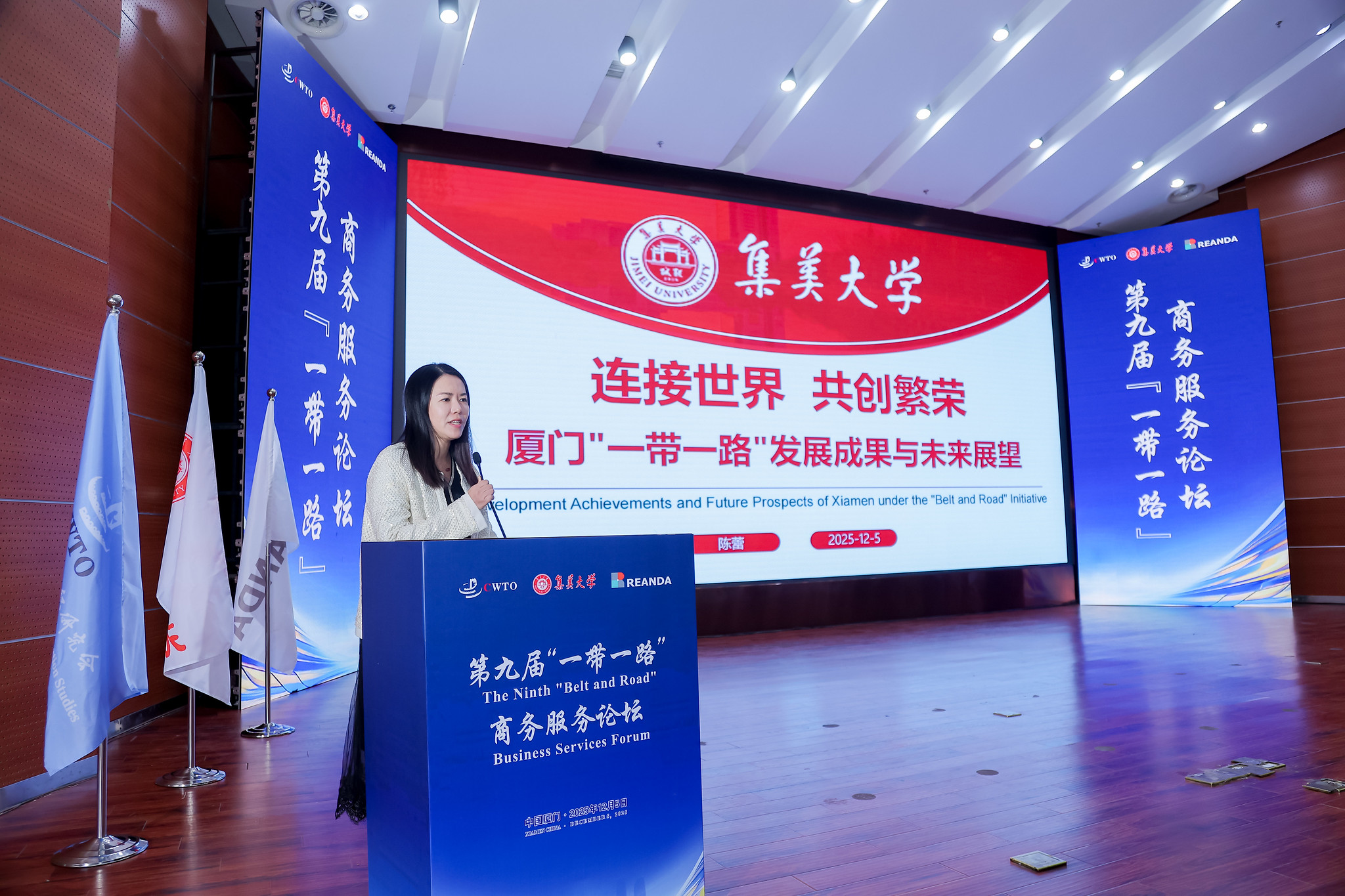 2025年12月5日,第九届“一带一路”商务服务论坛在厦门集美大学尚大楼105报告厅隆重举行。本届论坛由利安达国际、中国世界贸易组织研究会和集美大学联合主办,以“高水平商务服务护航‘一带一路’高质量发展”为主题,汇聚了来自全球服务贸易联盟、政府部门、专业机构、高校及企业的近500位代表。